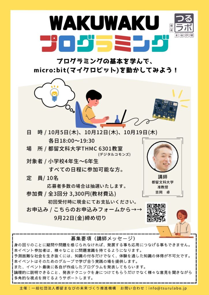 都留文科大学の吉岡卓先生を講師に、プログラミングを通して探究的に学びます。