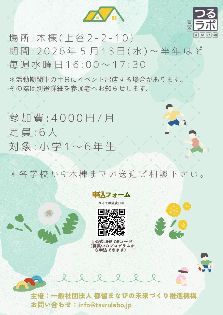 今後の事業・活動報告やプロジェクト開催のお知らせなど、つるラボにまつわる最新の情報をどこよりも早くお届けします。保護者の方はもちろん、教育・保育関係者の方、つるラボにスタッフや講師として関わってみたい!という方のご登録も大歓迎です。ぜひお気軽にご登録ください!