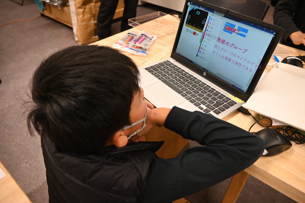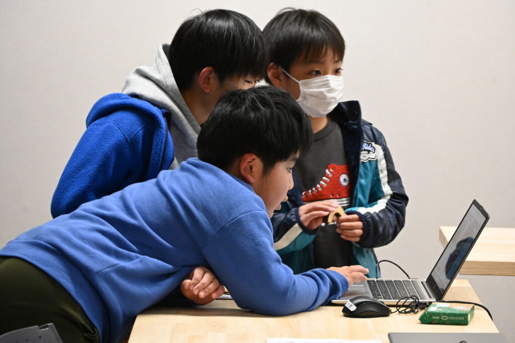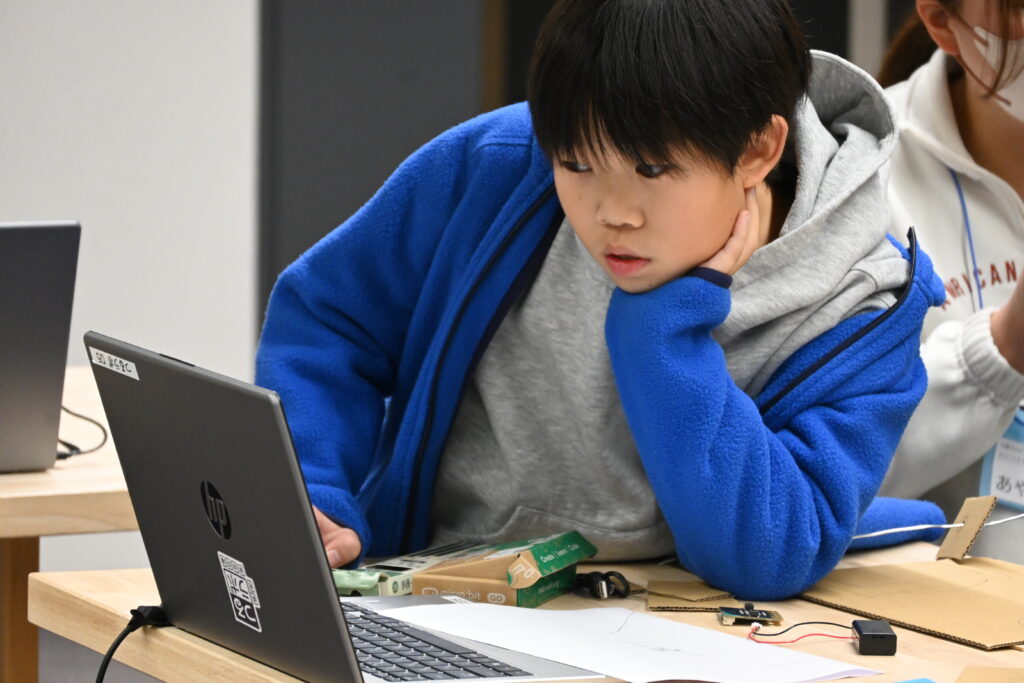 貯金箱を作っている子は、ゆさぶられたら音が鳴るというプログラムを、お金を入れたら音が鳴る仕組みに変えるために挑戦。