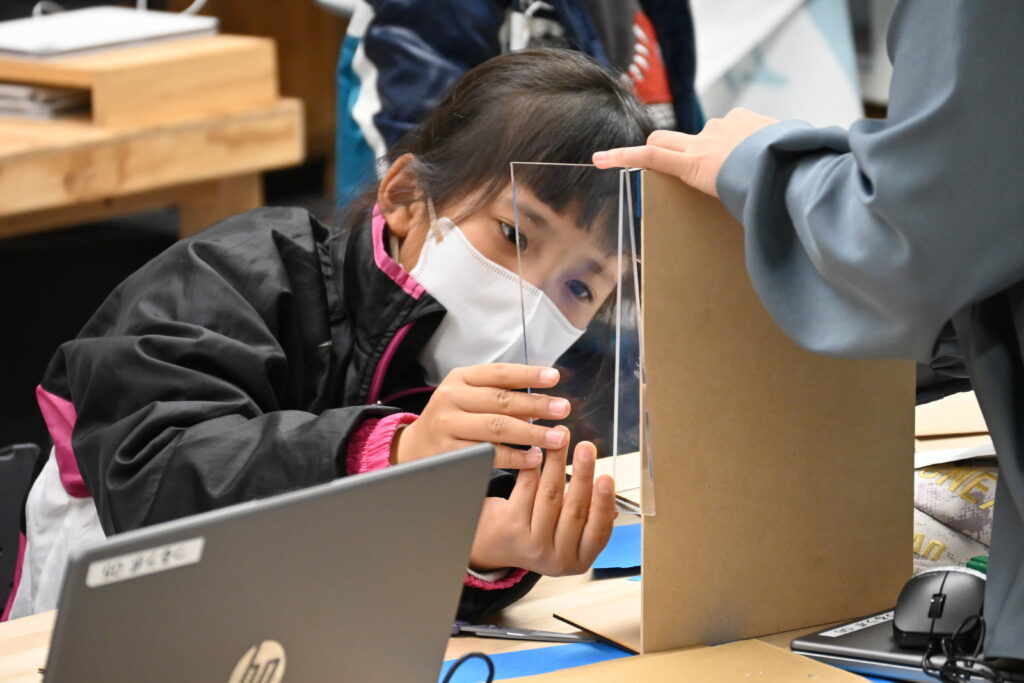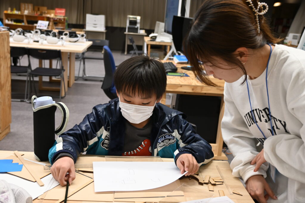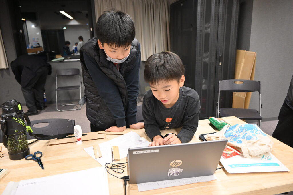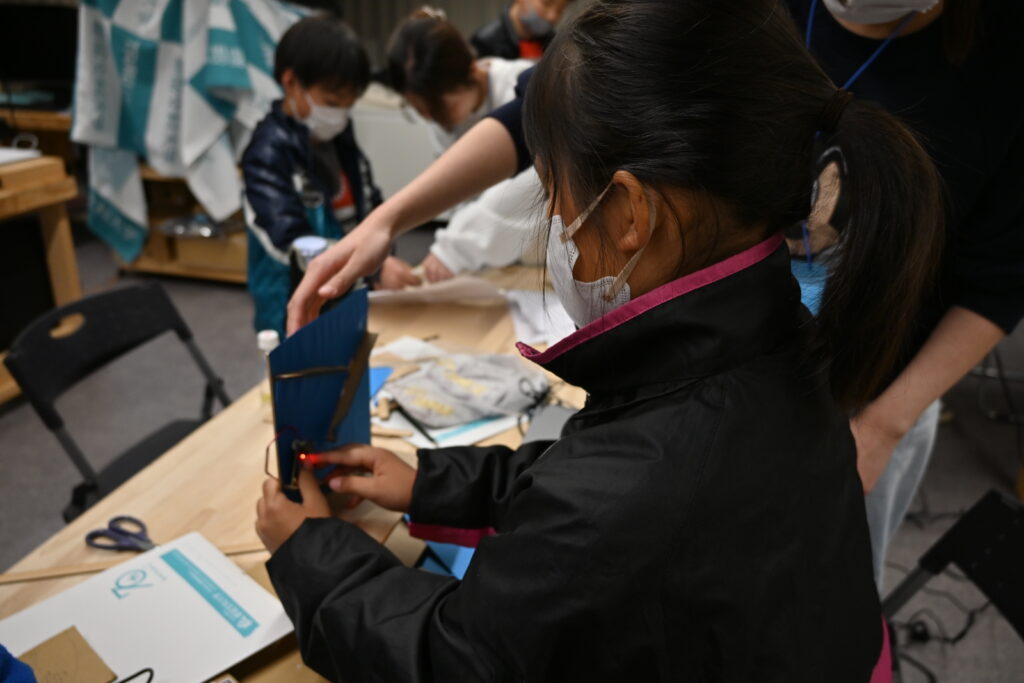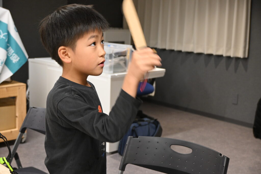 刀を振ったときに音が鳴るからくりそうちをつくっていた子は、仕組みそのものは完成したものの、「もっと音を大きくしたい」とこだわりを持って調整。