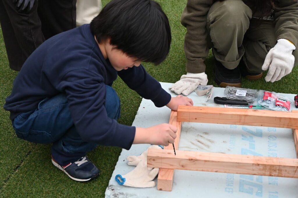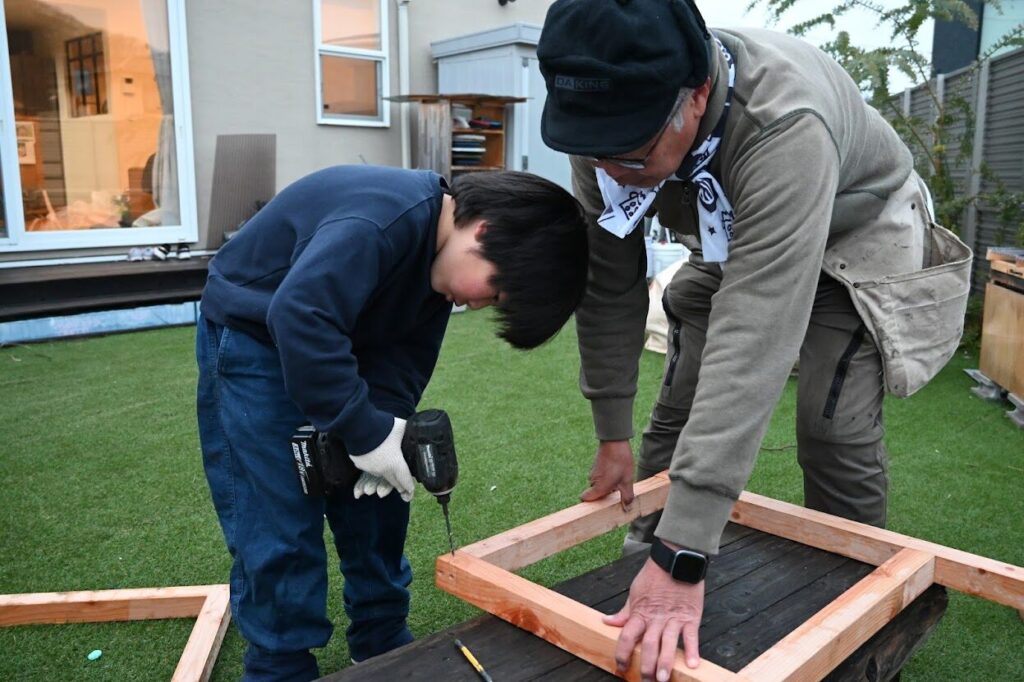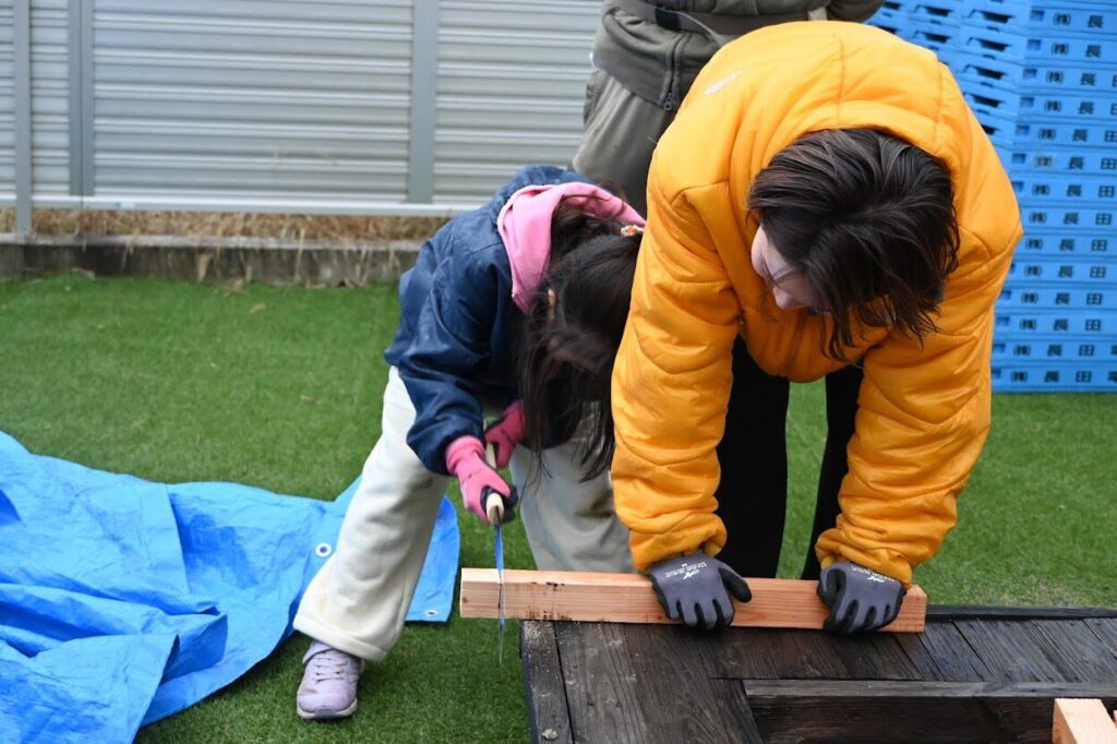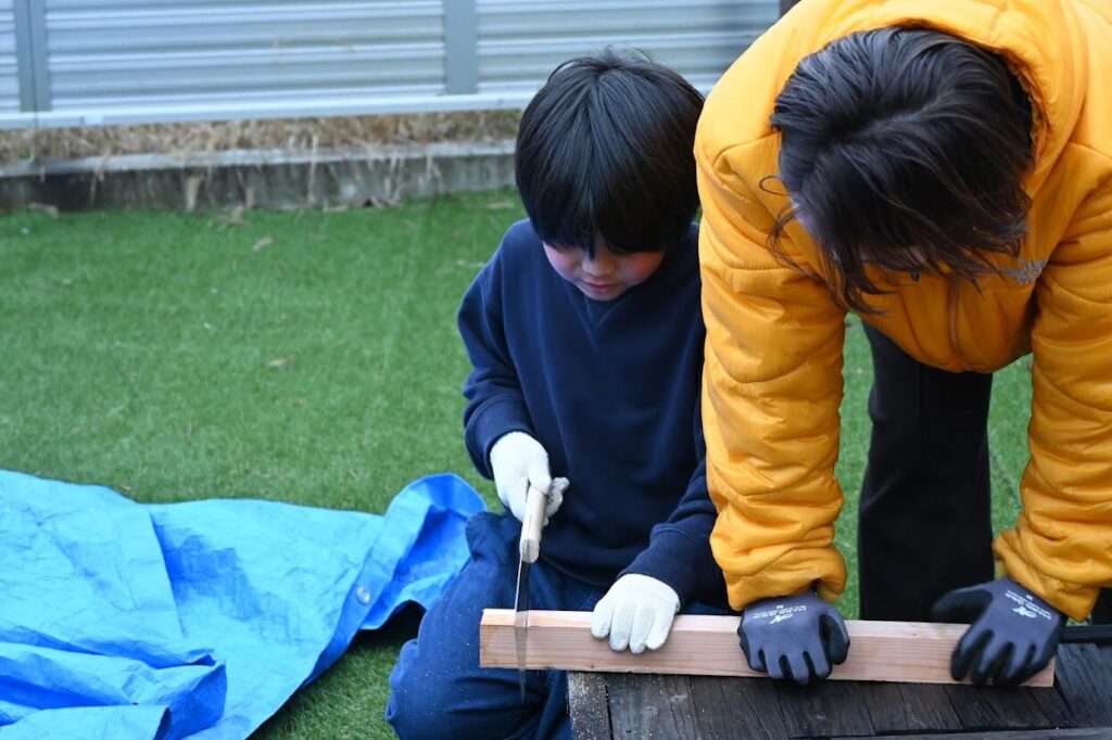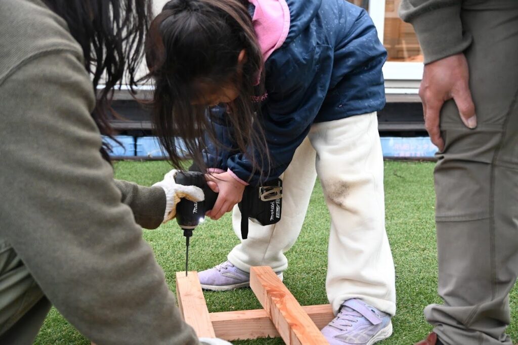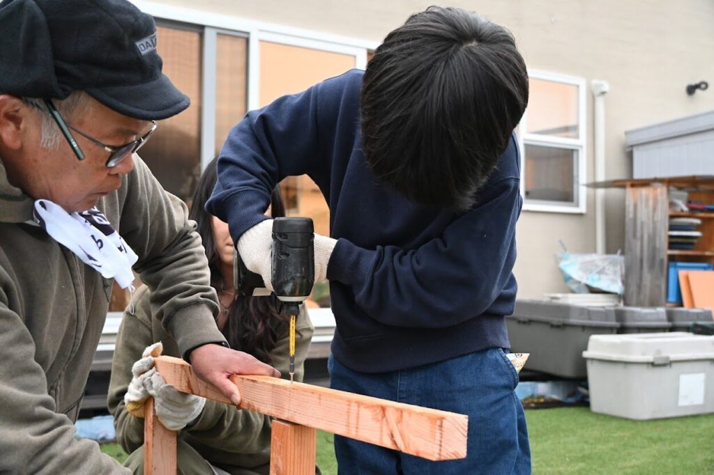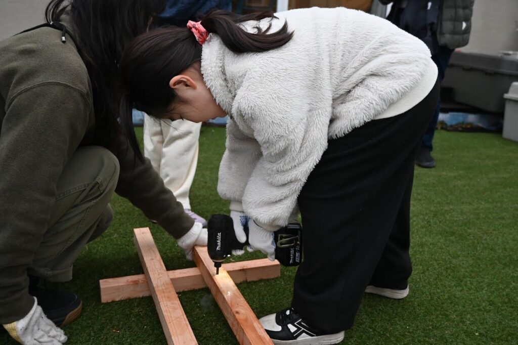 「穴開け隊~!」「はいはい~~!やる~。」と仲良くみんなでそれぞれ右と左の枠を完成させました。