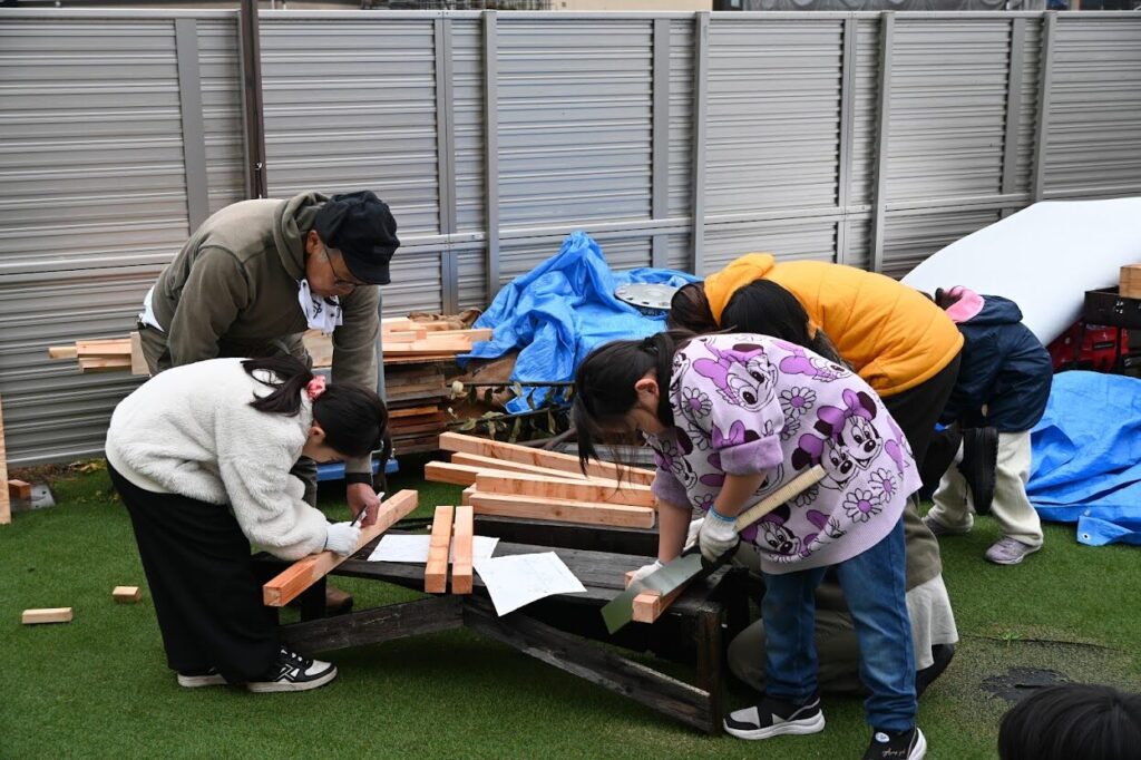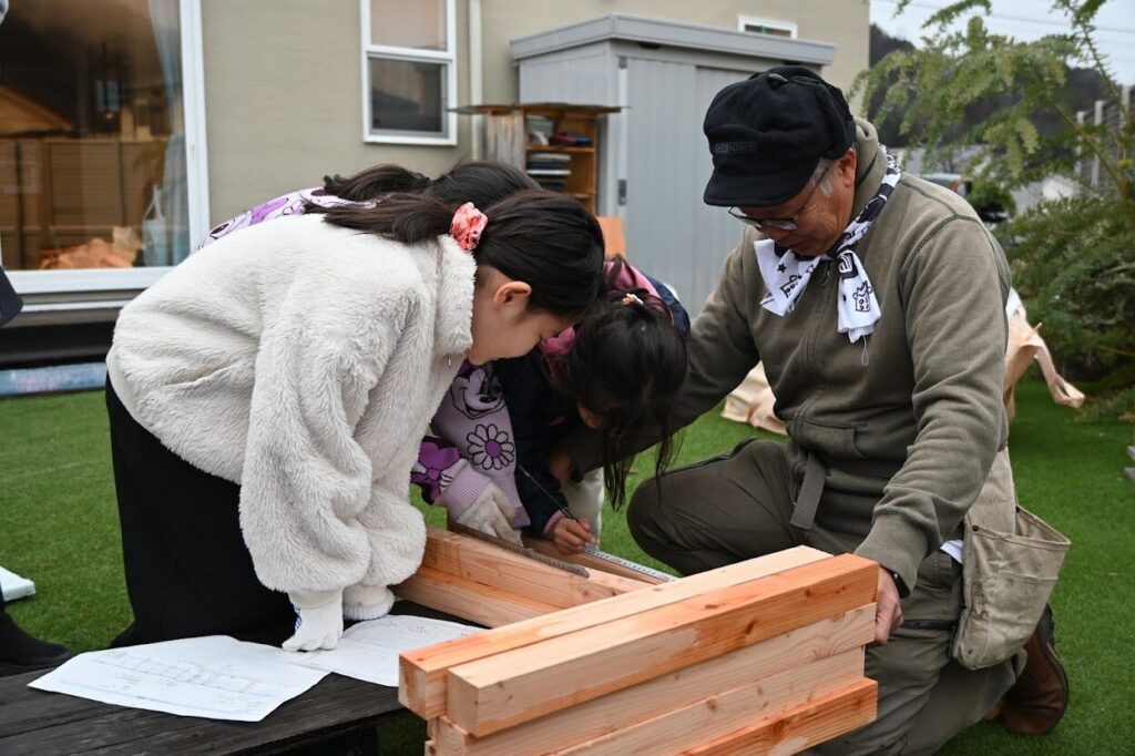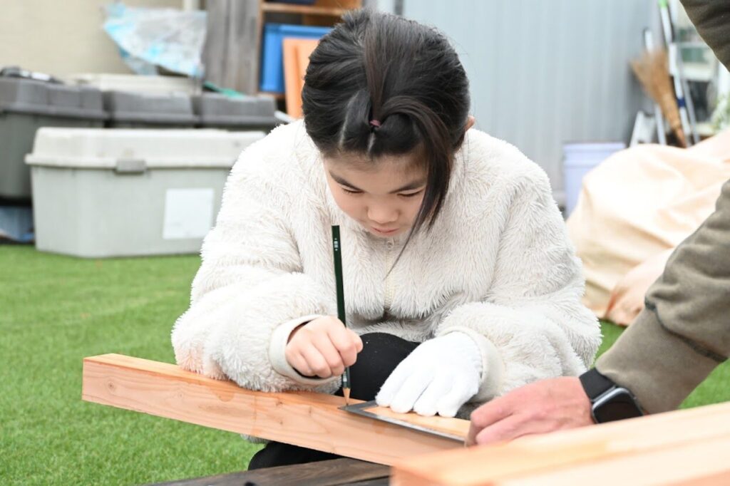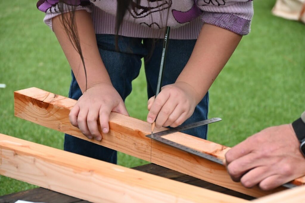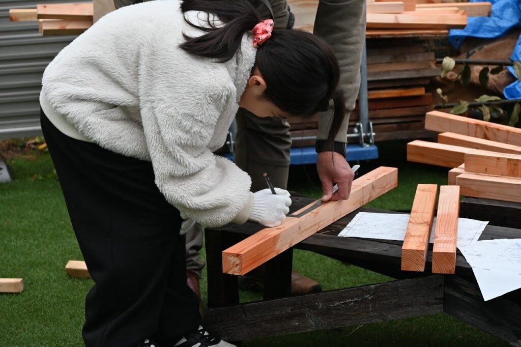 みんなで指矩(さしがね)で角を90度に合わせ印つけ後にカット開始。