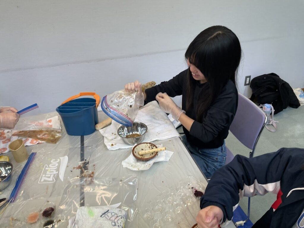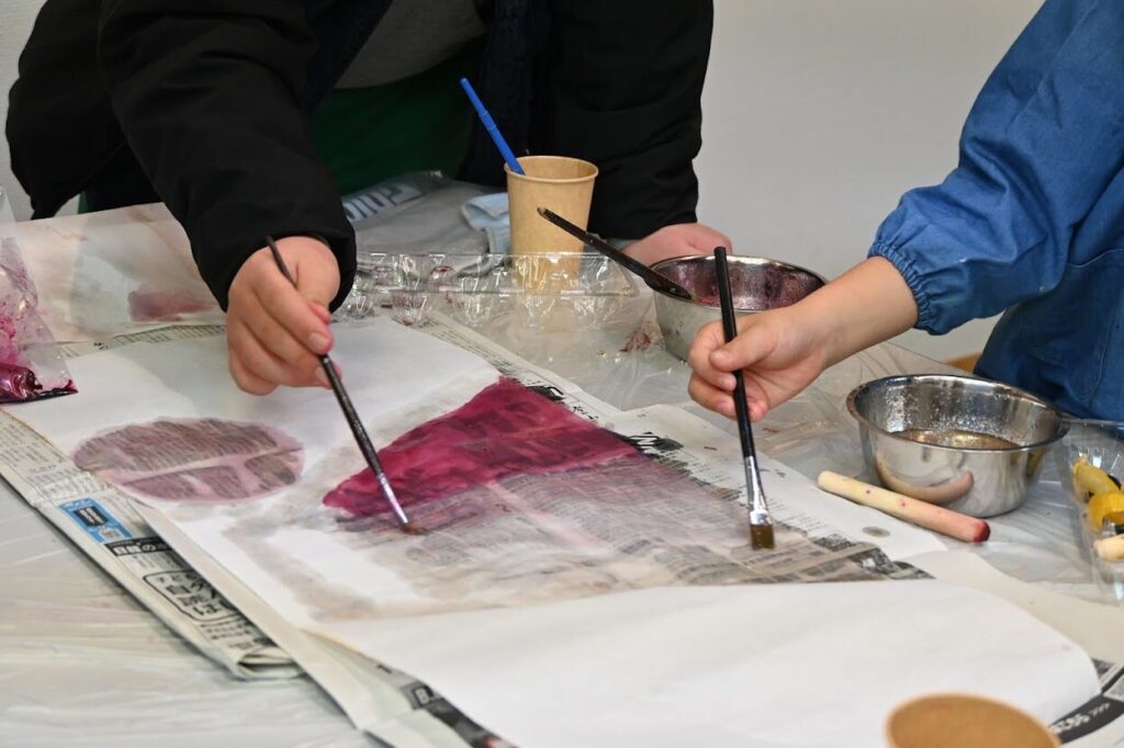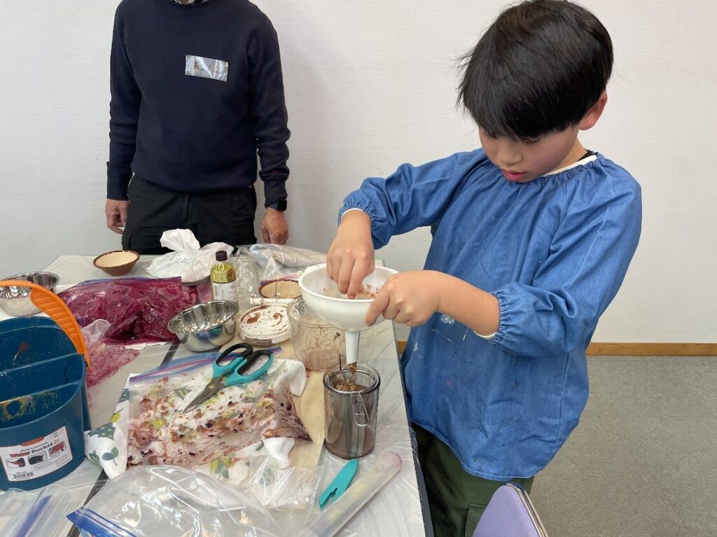 油絵は色が出ないのなぜだったのかみんなで考えると個体をもっと包丁やすって作って油と混ぜればよかった、実はミョウバンを使うと色止めできたかもねとヒントを出すと