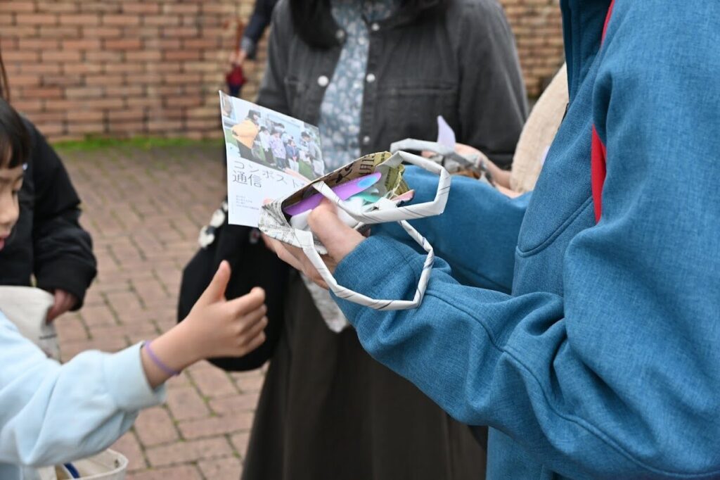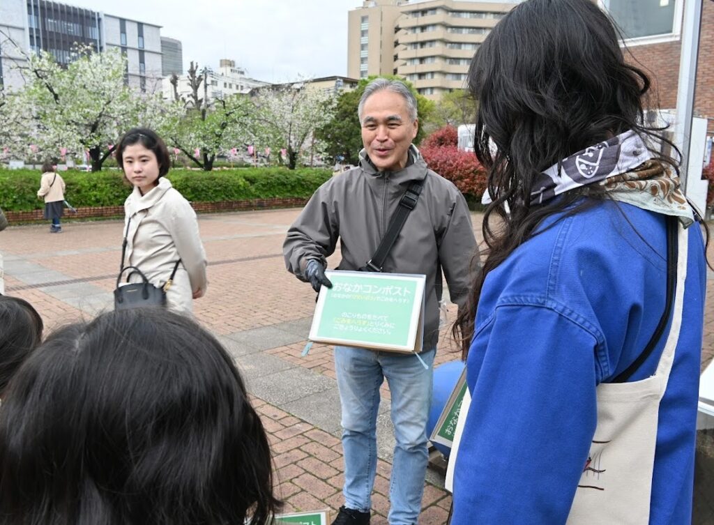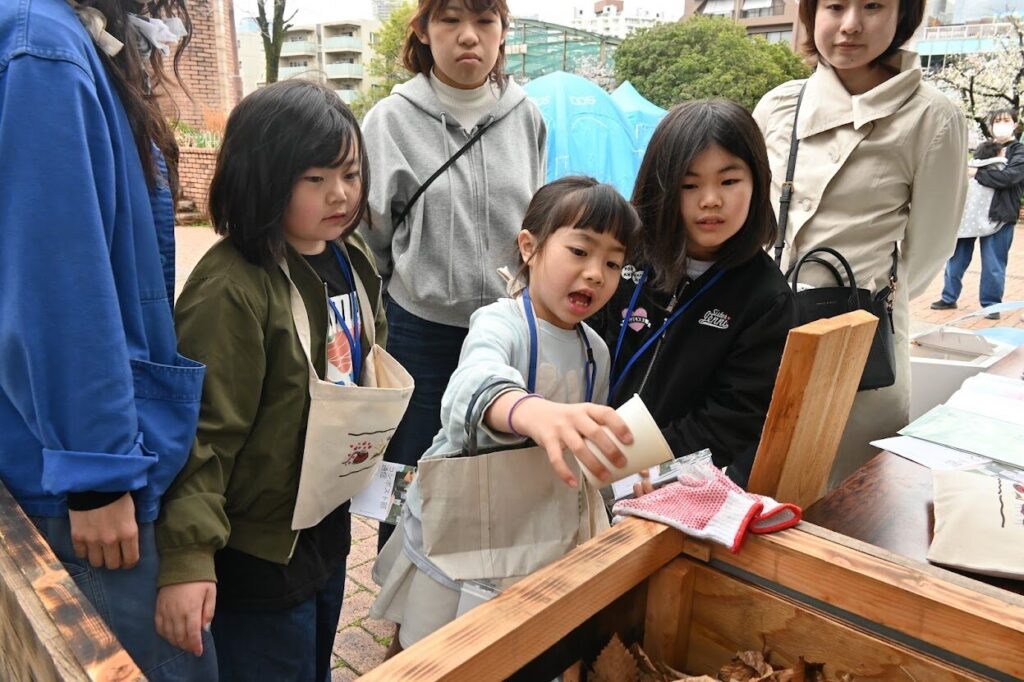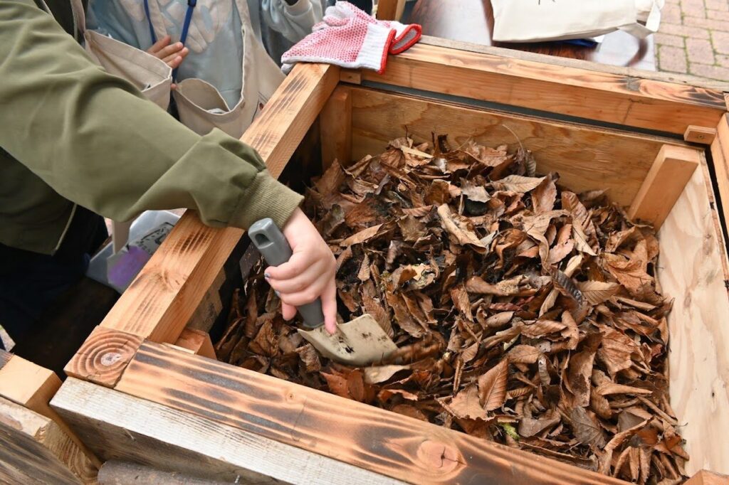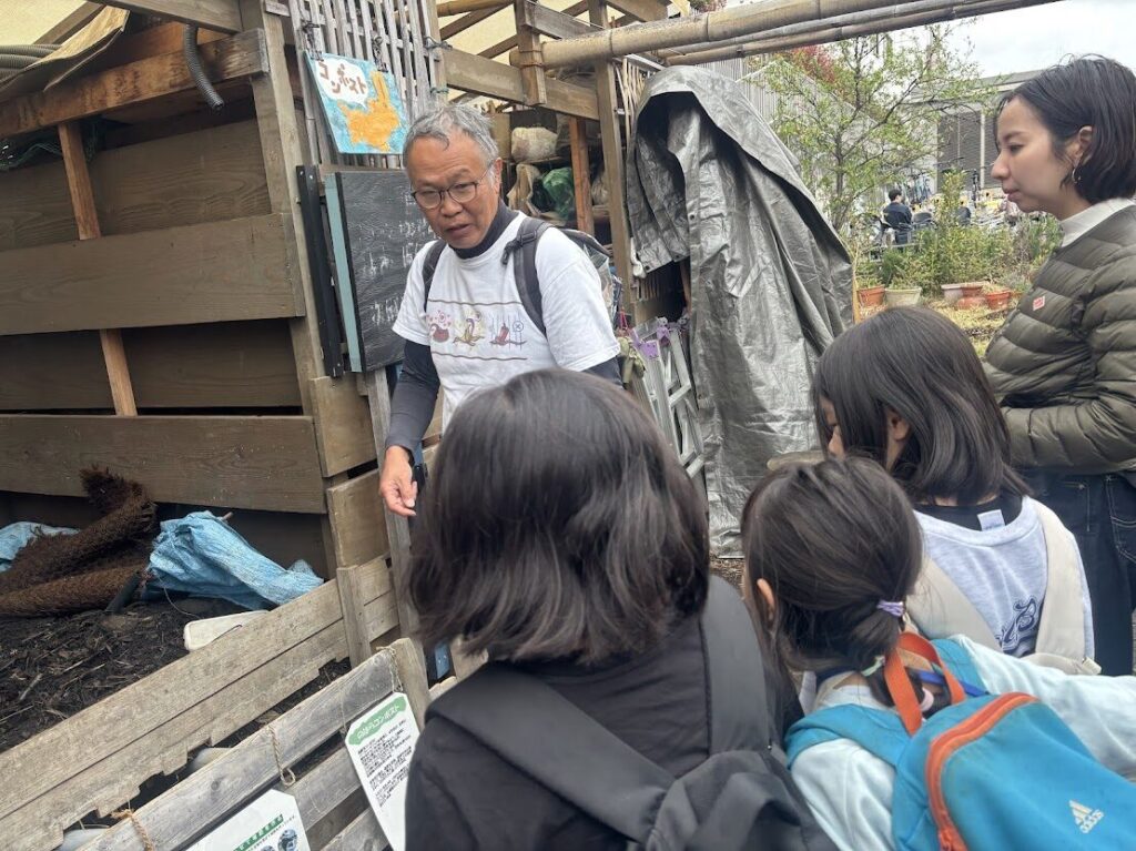 「ここでは近くの飲食店や美容室、コーヒー屋さん、フルーツ屋さんから生ごみをいただいて堆肥にしているんだよ」と教えてくれました。保護者の方もびっくり。