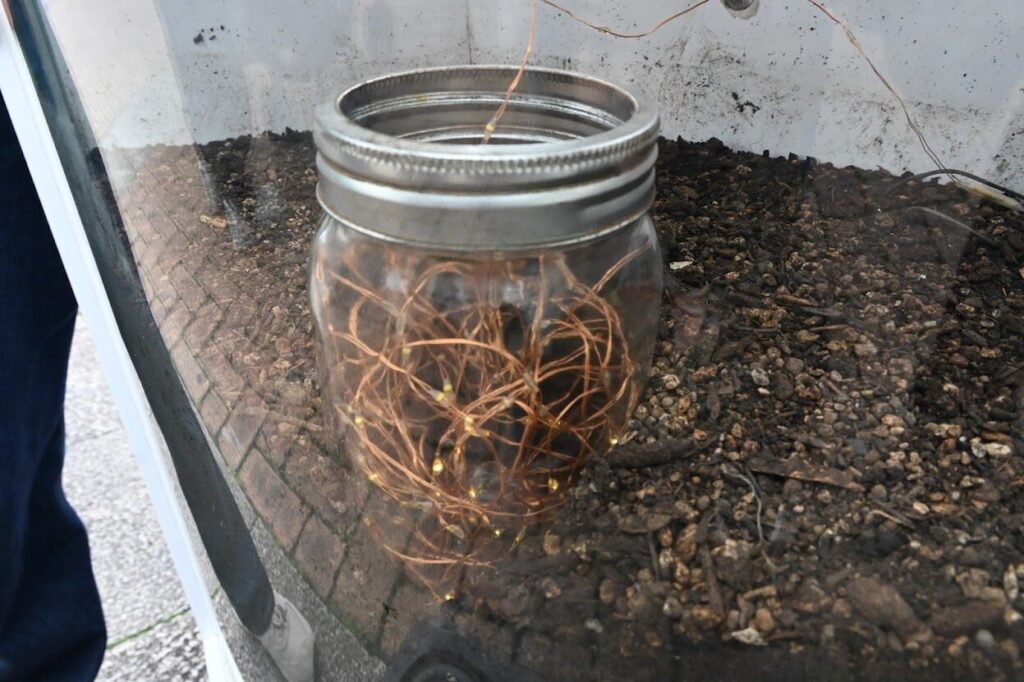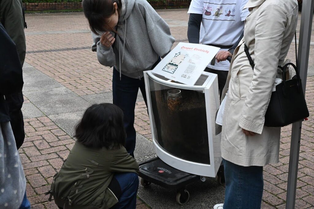 よしじさんも負けじと今観察中のコンポスト発電機。ピカピカ微生物の力で発電していました。「綺麗~」